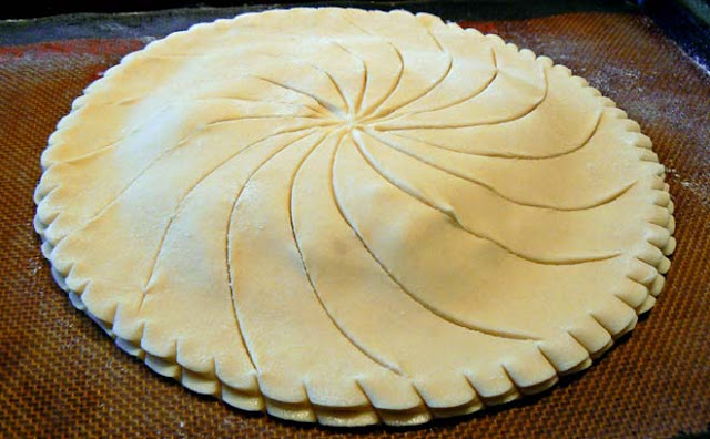 To make the galette, you roll the dough and cut two rounds, fill it with the frangipane, make some nice decorative cuts on top, glaze with an egg wash, and bake in a hot oven.