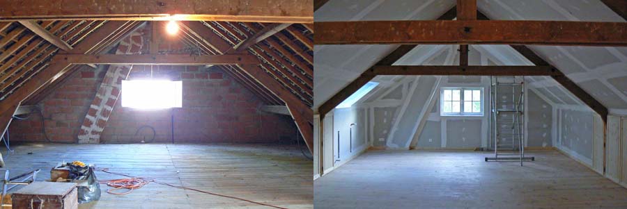 Looking southwest, and the boiler's chimney is completely boxed in with the niche and a closet, and the second Velux attic window is in place. You can see a bare light bulb in the before and after photos, but before, it was attached to the beam. In the after photos, the new bulb is hanging from a wire over the stairwell. We'll put a fixture up there after we paint.So that's pretty much it. We've now got to get moving on varnishing the wood floor and the stairs. After that we'll be able to sand, prime, and paint the walls. We'll be posting photos of that process as we go along.
