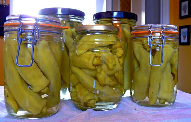 Five big jars of hot yellow peppers, ready to go into the cellar.