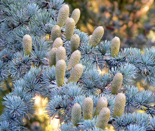 To me they look like cactus growing out of the scrub in some desert. In reality they're new pine cones growing on the fir tree outside the window of the den. The cones are less than two inches long and they won't get much bigger. When they fall they'll litter the ground and will have to be raked up.