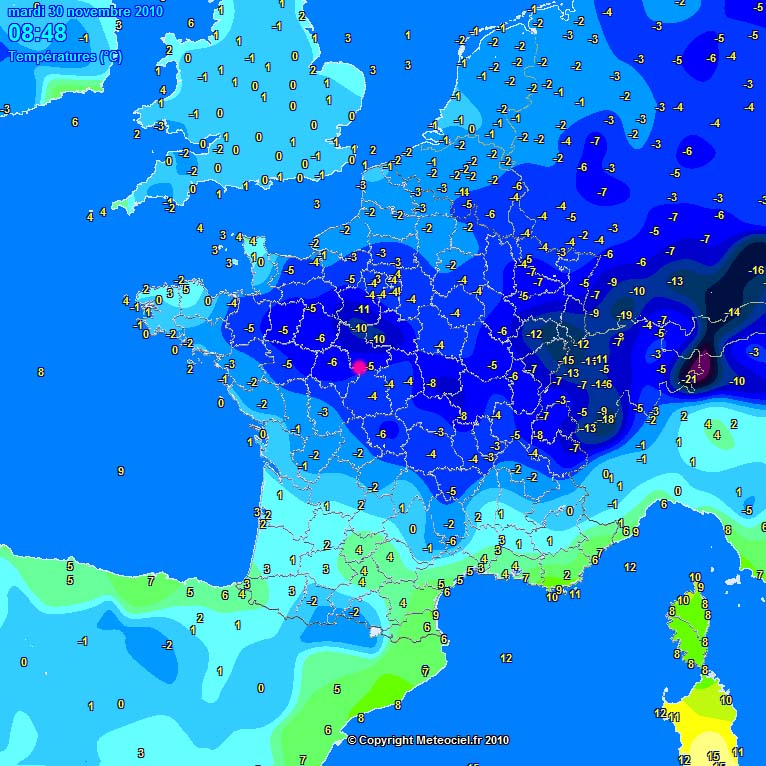 Apparently much of northern Europe in is the chill zone. The only thing really unusual here is the timing. This weather is more fit for January or February. This cold, this early, is newsworthy. The map above shows our Tuesday morning temperatures. We live where you see that hot pink dot in the middle of France.